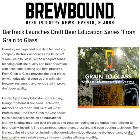 Sterling, Va., Nov. 10, 2022 – Inventory management and data technology company BarTrack announces the launch of “From Grain to Glass”, a free nine-part series blending draft line quality and beer education with actionable training and best practices. From Grain to Glass provides the beer industry with educational courses that will help brewery, restaurant, and venue staff improve draft beer quality.
