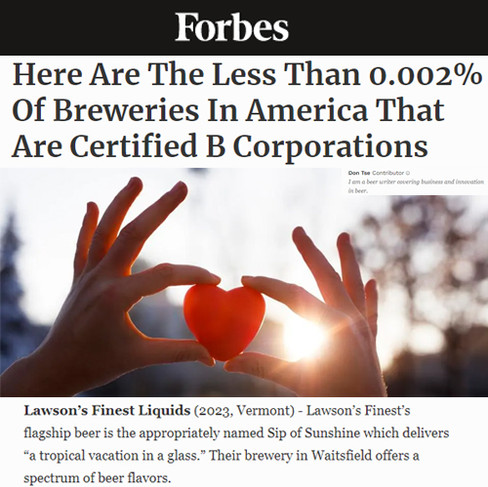 WAITSFIELD, VT (June 6, 2023) – Lawson’s Finest Liquids is proud to announce it has earned status as a Certified B Corporation. The award-winning Vermont-based brewery, founded by Sean and Karen Lawson in 2008, operates on a values-driven vision of making the finest quality beer while cultivating healthy, vibrant communities through ethical business and sustainability practices. Achieving B Corp certification is the latest step in the brewery’s 15 year history of commitment to positive social and environmental changes.